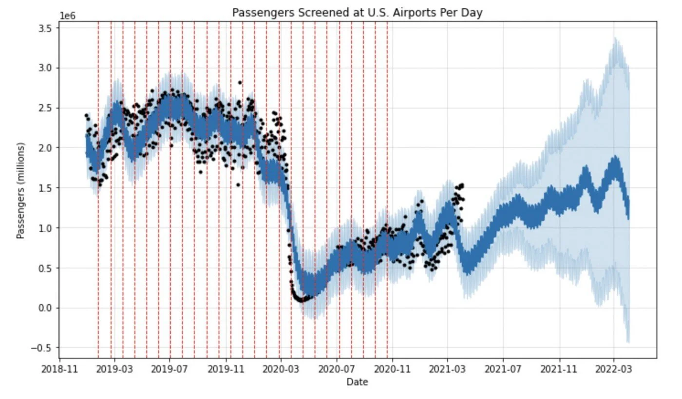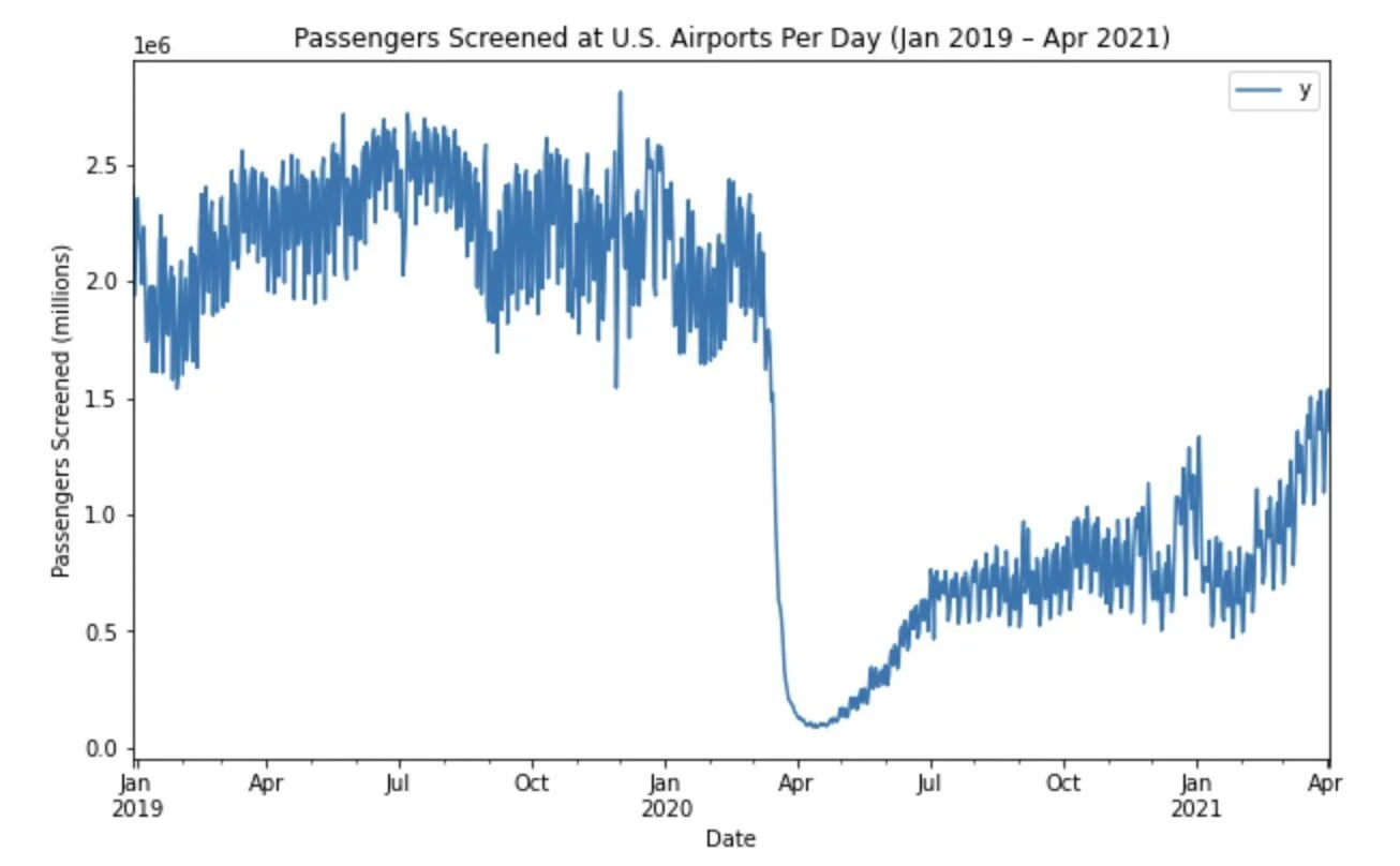 The travel industry was one of the most directly impacted sectors of the economy during the pandemic as international flights abruptly ground to a halt in March 2020 and many domestic carriers significantly reduced their flights. I was curious how the travel industry could rebound this year (2021) so I created a time series forecast using official TSA Checkpoint data, which measures how many passengers are screened per day at U.S. airports, to predict the number of passengers that will be screened this year and specifically sought to find how this number will compare to pre-pandemic levels in 2019.