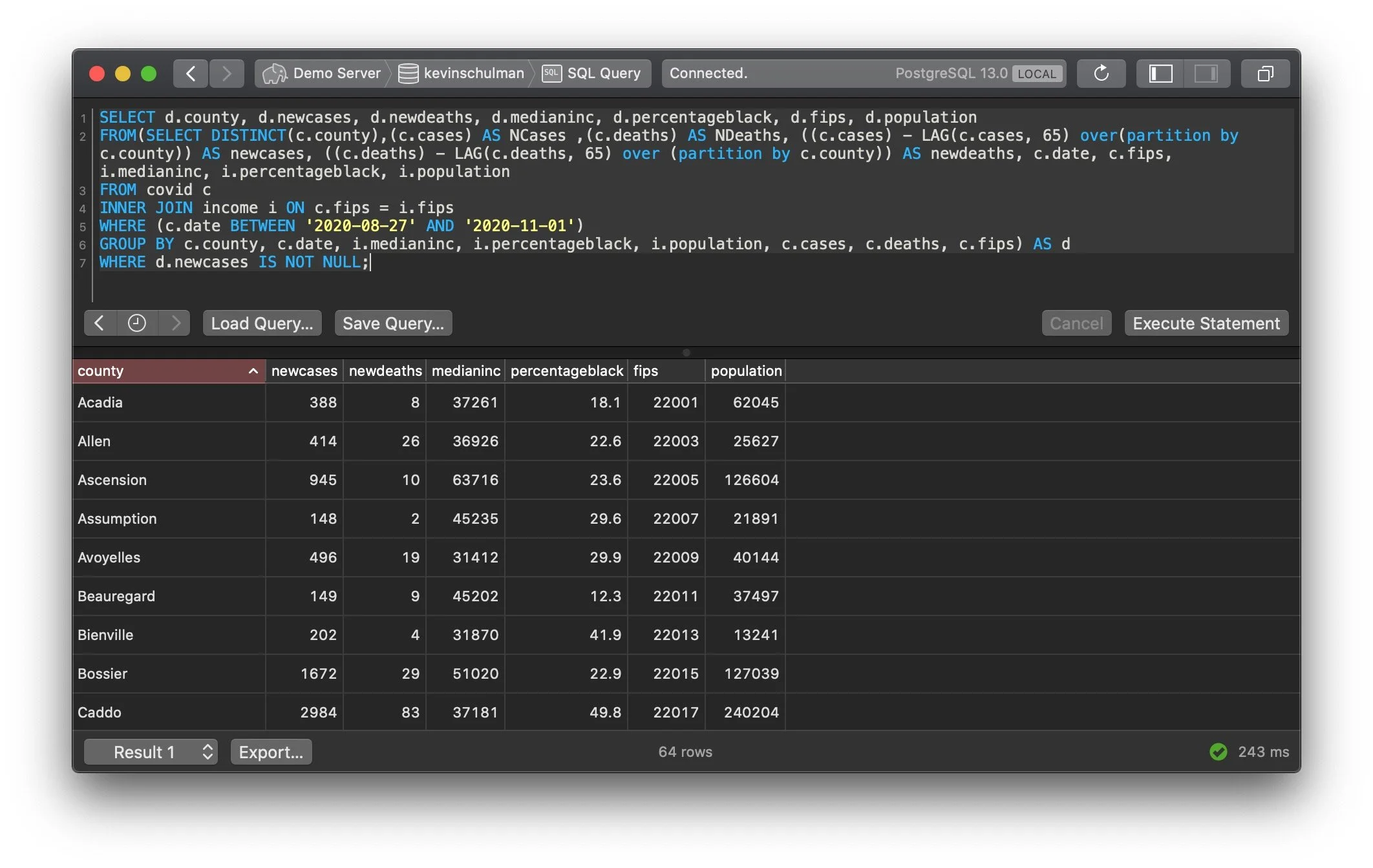 I wondered how the assembly line of natural disasters had impacted the spread of COVID throughout the state and decided to analyze both COVID and demographic data for any trends. I created a Postgres database using the NYTimes COVID repository as well as demographic data from the Census Bureau and wrote a SQL query to retrieve parish-level data about the number of new cases and deaths from August 27th, when Hurricane Laura made landfall, until October 31st, several weeks after the landfall of Hurricane Delta on October 9th with additional information about median income, population, and demographics. Finally, I visualized the data using Tableau to look for patterns.
