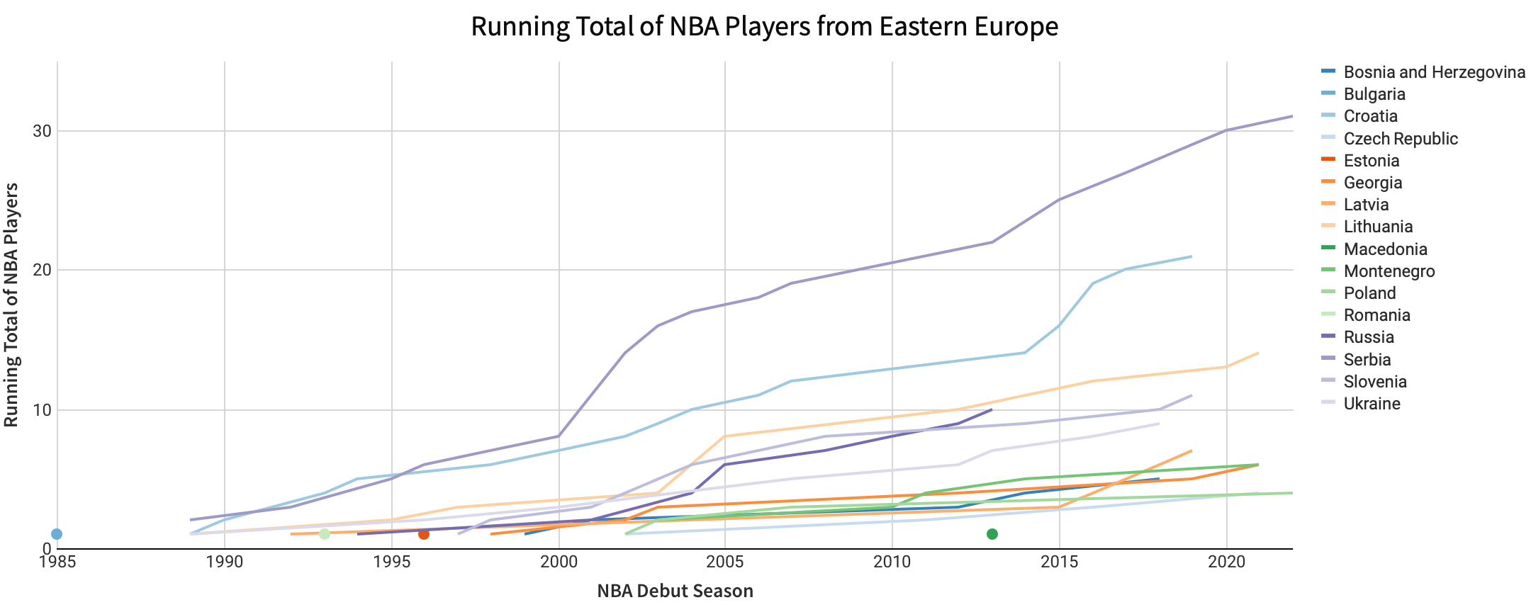 The NBA has become the most popular U.S. sports league internationally over the past few decades with CNBC reporting that the league expects fans from 214 different countries to tune in this year and that a record number (125) of international players were on opening-night rosters this season. However, I was particularly interested about another important time for the NBA internationally: the last years of the Cold War. I read an article that mentioned how the Soviet Union first allowed their players to join the NBA at the end of the 1988 Olympics. As a result, I visualized the running total of NBA players from Eastern Europe to illustrate the influence of those early trailblazers like Vlade Divac (Serbia), Drazen Petrovic (Croatia) and Sarunas Marciulionis (Lithuania) who all joined the NBA in 1989 and whose countries now account for the top three most NBA players from Eastern Europe. Those early players paved the way for current stars such as Kristaps Porzingis and the rise of the NBA as an international success.