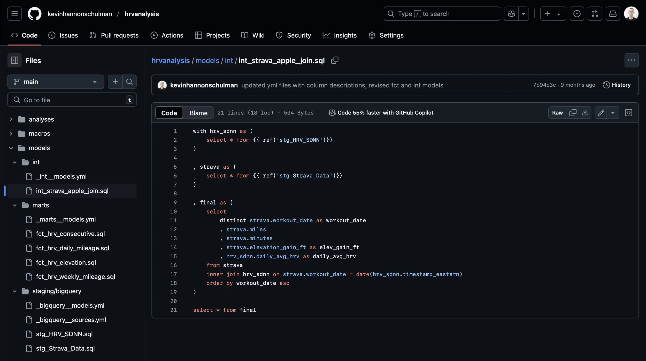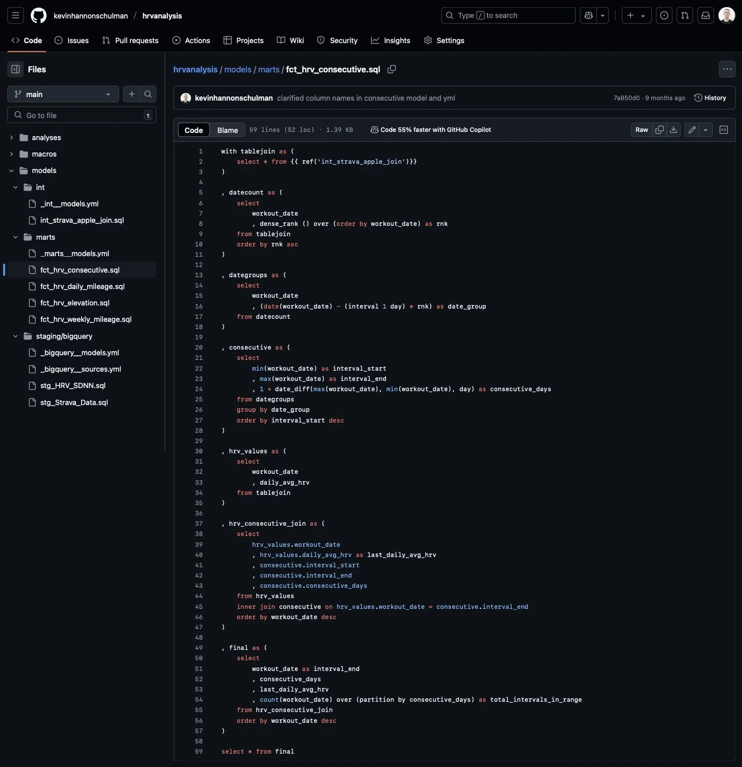 I created a new project in BigQuery and dbt Cloud, loaded the .csv files into two tables in BigQuery that will serve as the sources in my dbt DAG, and initialized my dbt project. Next, I built my data models (e.g. staging, intermediate and fact models) and .yml files in dbt Cloud to analyze the impact on HRV of each metric of running strain. While building my consecutive days model, I knew that I needed to solve the gaps and islands problem and found this article to be particularly helpful. My full code is available to view on my GitHub.